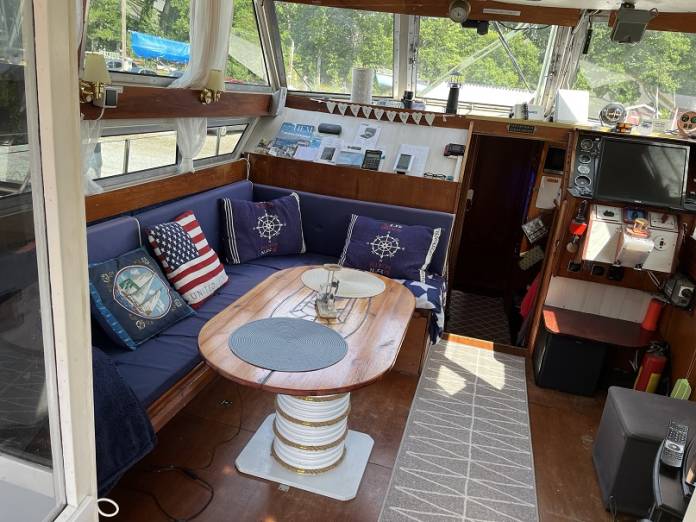 Utrymme layout talar för sig själv i bilderna, vilket är tagna i sjön förra året, ....finns i nuet ,taget på land med täckning , motorerna går bra, 2 st perkins dieslar på vardera 145 hk...en hel det elektronik....el reglage