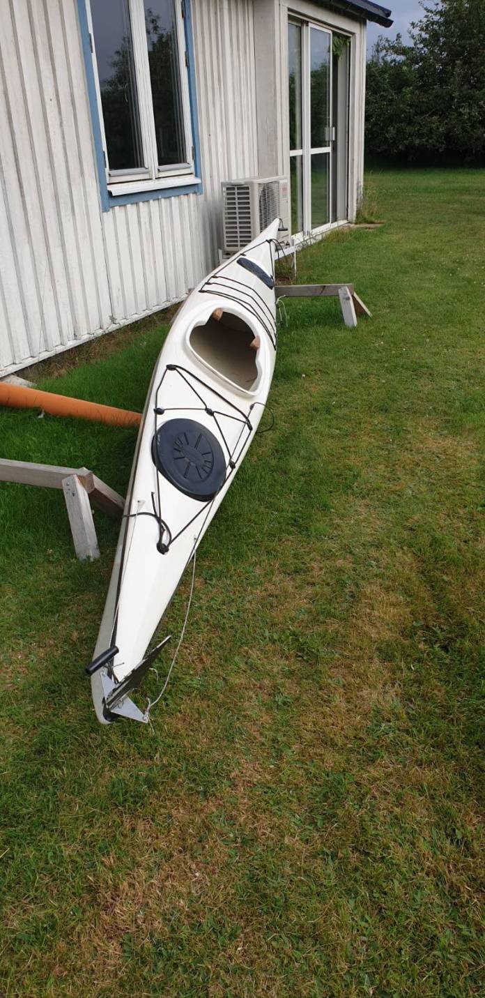 Havskajak vit. Lättpaddlad havskajak med roder och dubbla stuvutrymmen. Glasfiber. Bra skick. Kapell ingår.